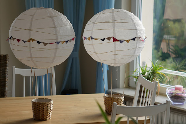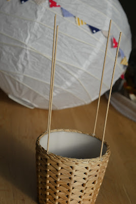 Mit diesen Heißluftballons habt ihr verschiedene Möglichkeiten. Ihr könnt den Korb Beispielsweiße mit Blumen schmücken oder es als Lampenschirm verwenden (allerdings würde ich da anstatt der Schaschlikspieße Schnüre verwenden, damit der Korb zur Seite baumeln kann falls man sich den Kopf anschlägt ;-).