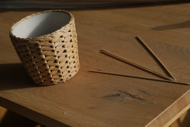 Klebt mit dem Heißkleber die vier Spieße gleichmäßig an euren Korb (in meinem Fall der Blumenübertopf).