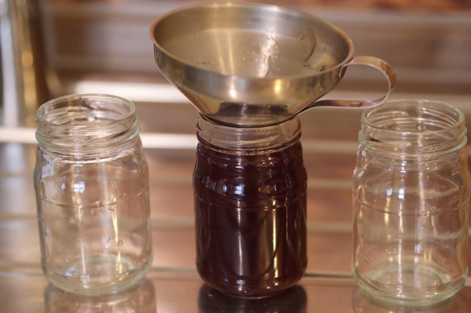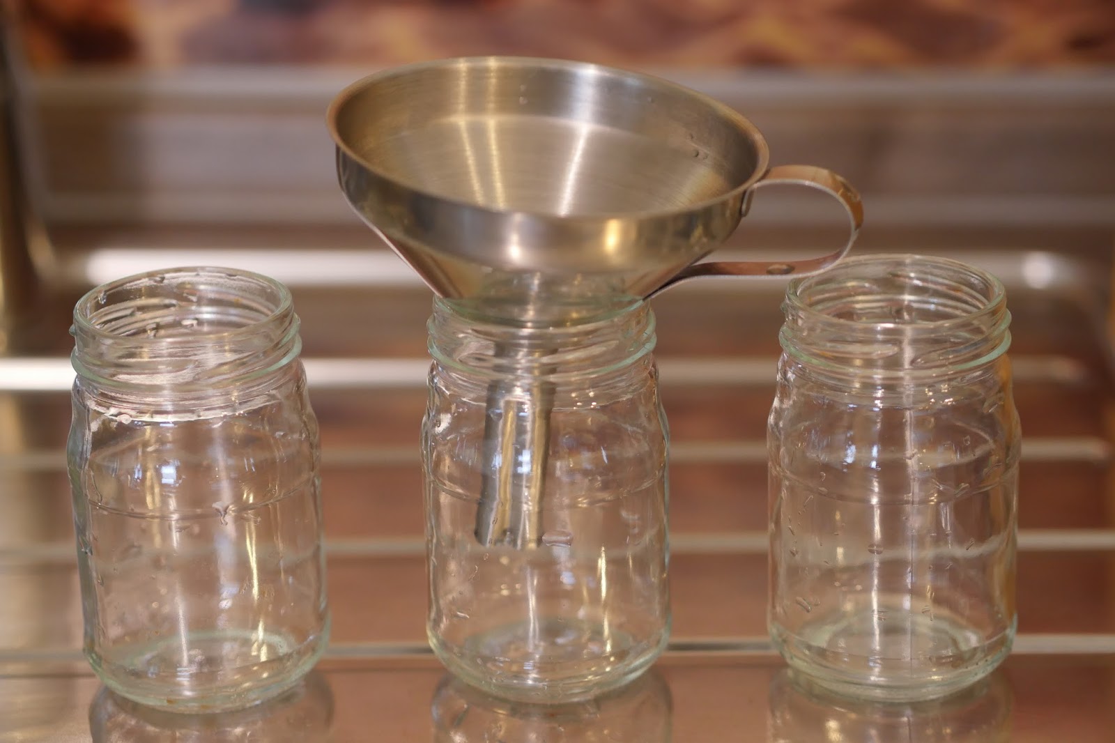 Kocht nebenher eure leeren Gläser mitsamt den Deckeln und dem Trichter mit kochendem Wasser aus.