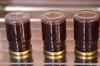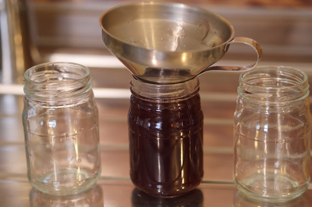 Jetzt muss alles ganz schnell gehen bevor das Gelee zum abfüllen zu fest wird. Stellt eure Gläser bereit mit dem Trichter, damit es gleich ans Einfüllen gehen kann. Ich mache das am liebsten über der Spüle damit die Sauerei nicht so groß ist falls etwas daneben geht