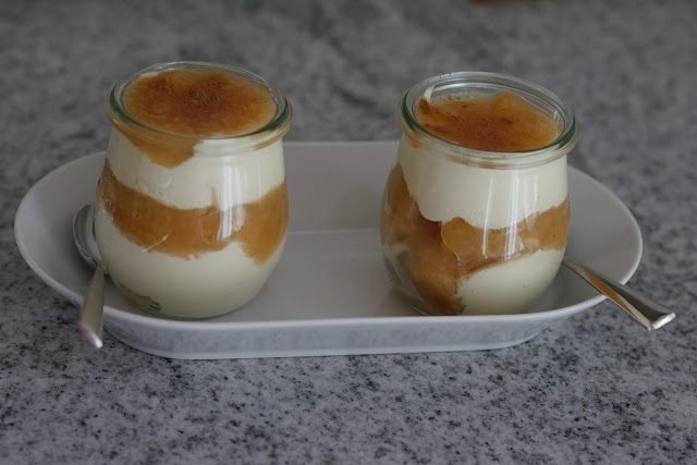 Gebt als Abschluss wieder eine Schicht Apfelmus darauf. Streut als Deko noch etwas Zimtzucker auf jedes Glas.
