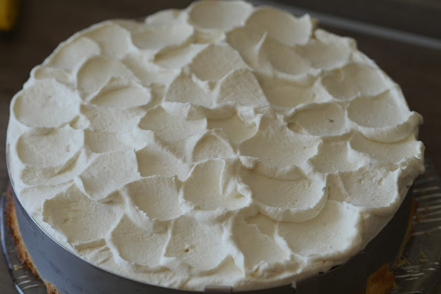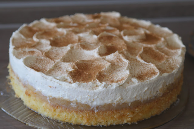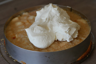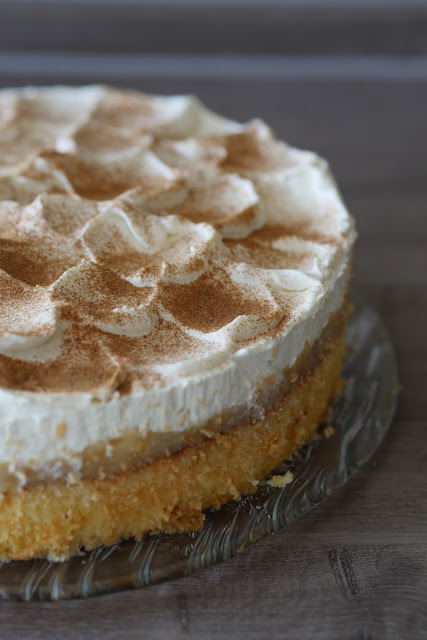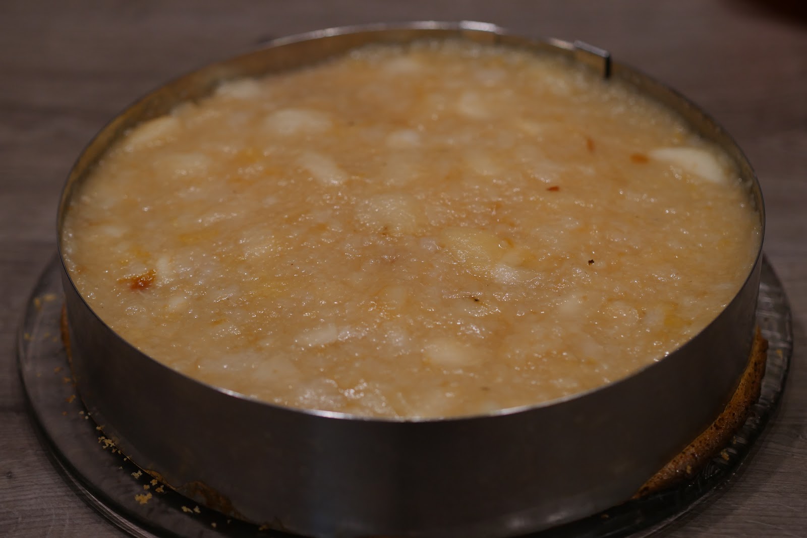 Legt den Tortenring um den Bisquit (ich habe meinen direkt darin gebacken), und legt ihn auf eine Tortenplatte, die in euren Kühlschrank passt. Verteilt das Apfelmus auf dem Boden und