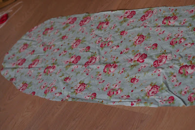 Legt dann den Schaumstoff und den neuen Bezug auf das Bügelbrett und zieht dann den Faden bzw. das Gummi zu und schließt es mit einem Knoten.