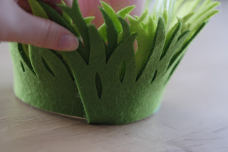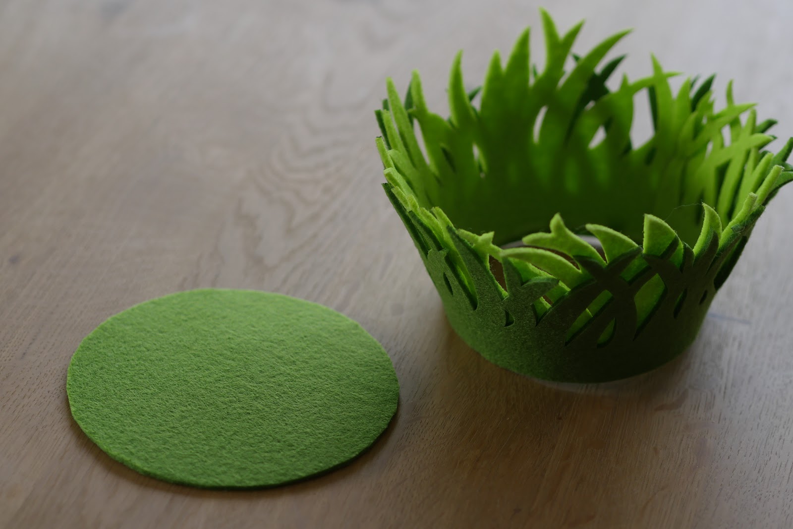 Außerdem braucht ihr dicken sehr steifen Filz in einem oder mehreren Grüntönen. Aus diesem schneidet ihr eine Wiese aus. Wenn euer Glas gerade nach oben geht und nicht nach oben hin breiter wird könnt ihr die Wiese gerade schneiden. Ansonsten müsst ihr es wie oben auf dem Bild in einem großen Bogen ausschneiden. Je steiler euer Bogen ist umso mehr steht der Filz auch oben ab.