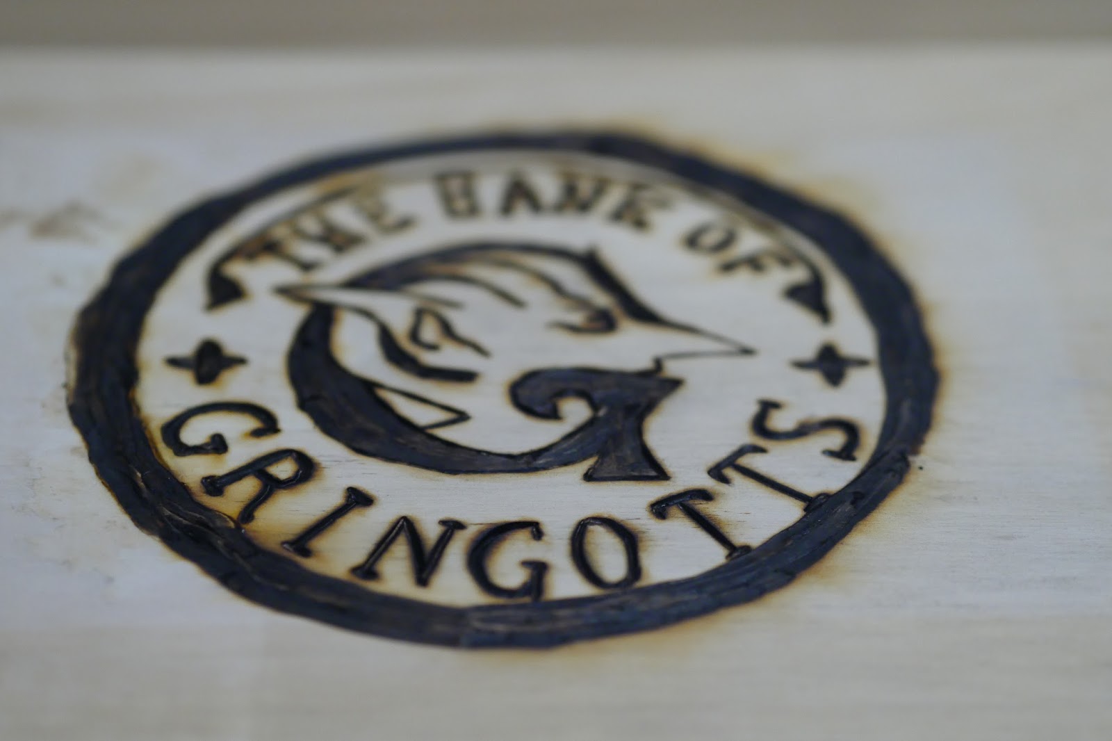 Bei Google hab ich ein ganz nettes Logo von Gringotts gefunden. Das habe ich auf den Deckel meiner Holzkiste, die ich noch zu hause gefunden habe, übertragen und mit dem Bandmalkolben (Siehe Muggelzauberstäbe) in das Holz gebrannt.