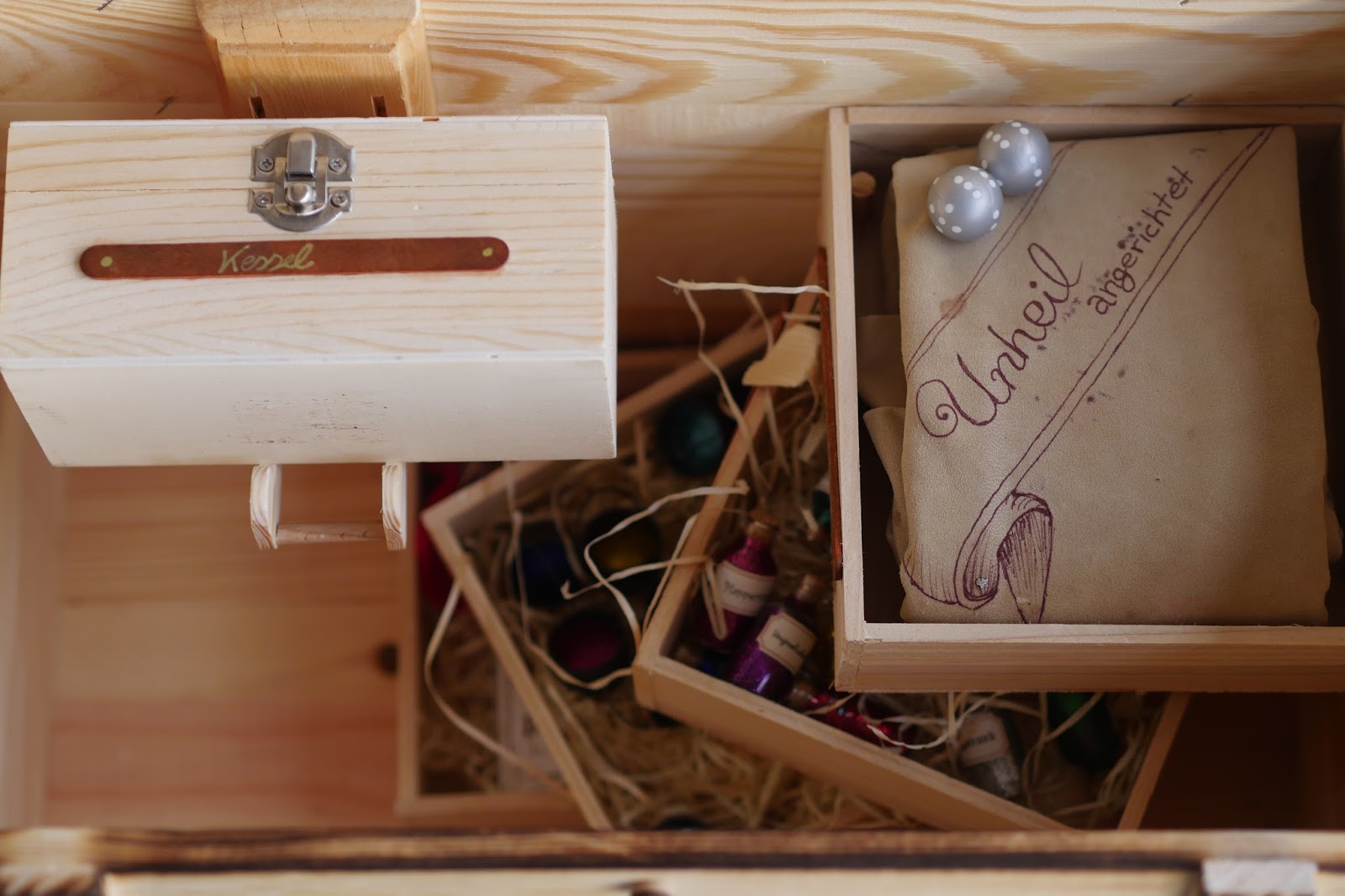 Es besteht aus vier gleich großen Holzkisten mit Holzwolle in dem alles seinen Platz findet.