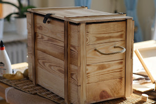 Die Optik der Kiste sollte an eine alte Versandkiste erinnern. Darauf habe ich dann