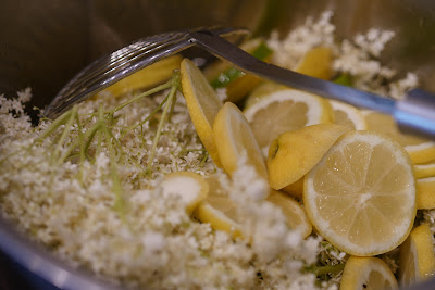 Schneidet eure Zitronen und Limetten in Scheiben und gebt diese gemeinsam mit den Holunderdolden in euren Topf.