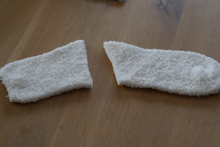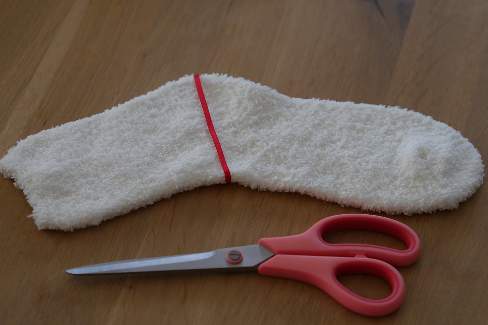 Die untere (geschlossene) Seite der Socke wird nun etwa zur Hälfte mit der Watte aufgefüllt. Traut euch ruhig ein wenig zu stopfen und es als Kugel zu formen. Damit der Schneemann von alleine stehen bleibt könntet ihr unten auch ein wenig Reis einfüllen.