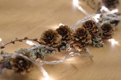 Um das Ganze noch ein wenig Stimmungsvoller zu machen, gerade auch jetzt an den regnerischen Herbsttagen (wobei diese ja bisher eher noch auf sich warten lassen) habe ich eine Lichterkette um einen Ast mit Zapfen gewickelt.