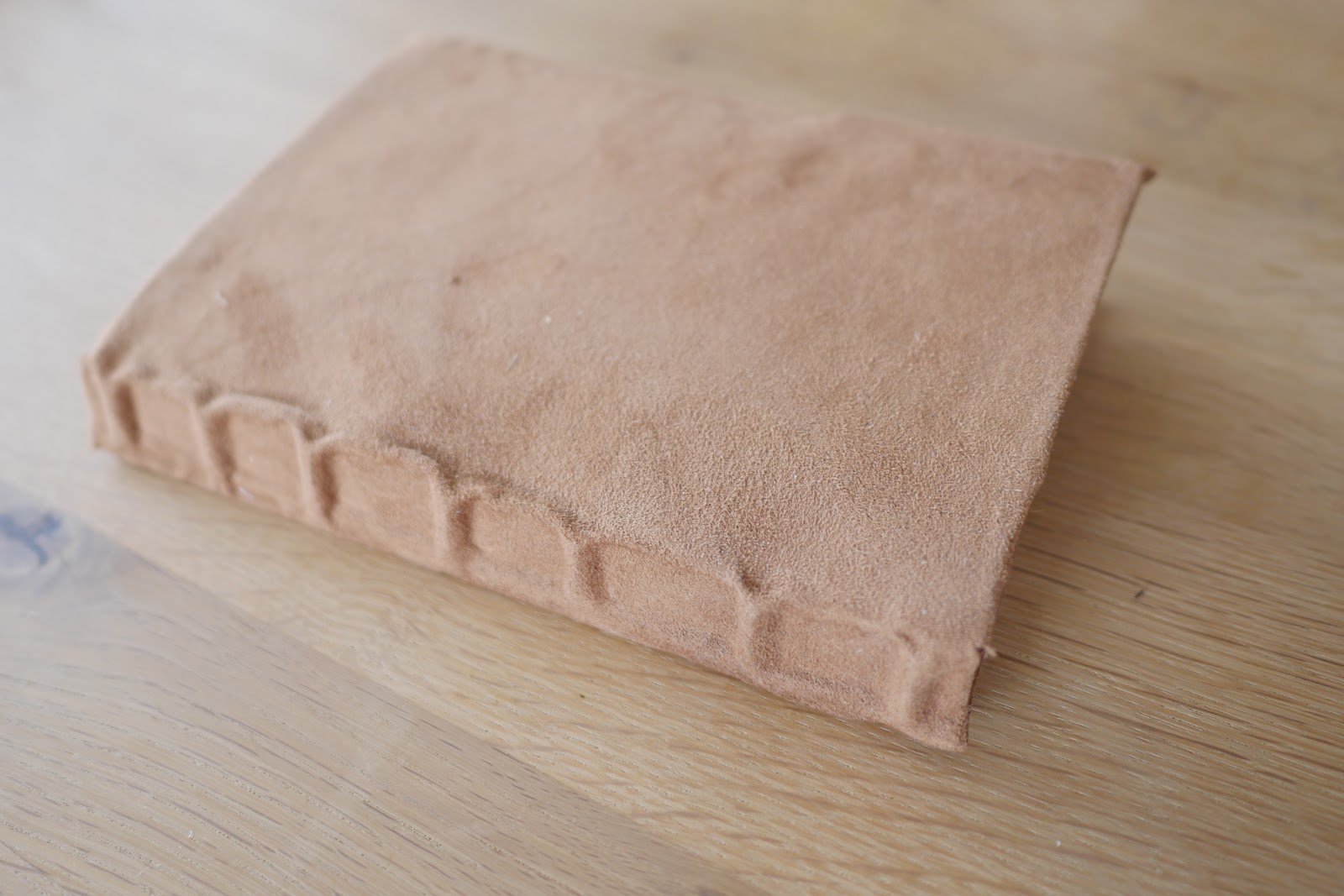Nun geht es an den restlichen Einband. Gebt dazu Leim auf das Seitenteil…