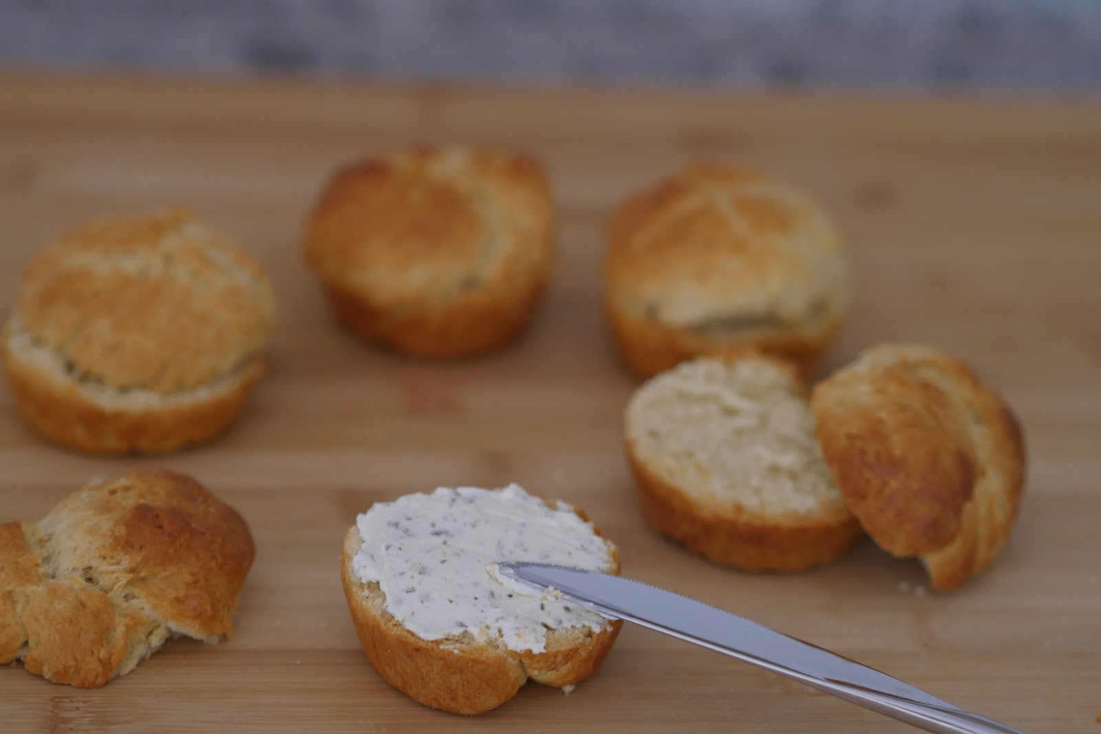 Schneidet die Brötchen mindestens 1x wenn es von der Größe reicht 2x durch (damit es nicht zu trocken ist)und bestreicht es mit dem Kräuterfrischkäse.