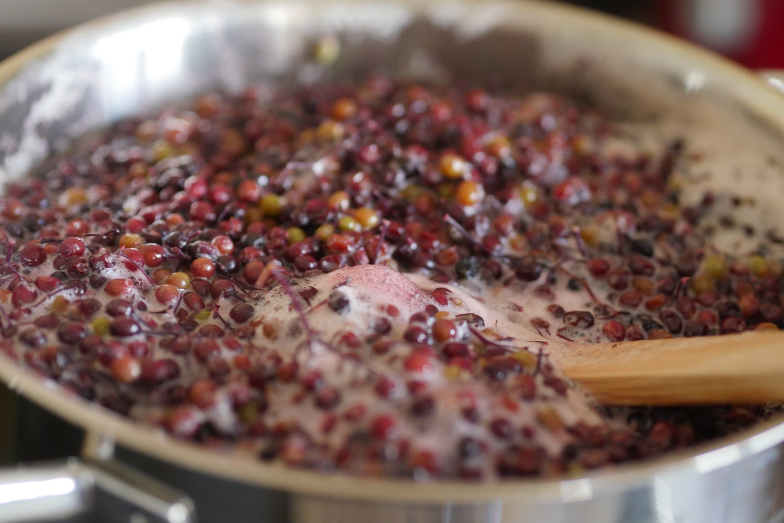 Falls sich ein paar grüne Beeren eingeschlichen haben könnt ihr diese heraus suchen. Übergießt die Holunderbeeren mit dem Wasser. Das Wasser sollte die Beeren bedecken. Gießt evtl noch etwas Wasser nach.