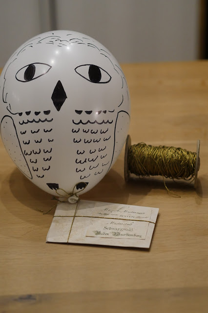 Dann sucht ihr euch ein schünes Band oder eine Schnur und bindet den Brief der Eule ans Bein. Wenn ihr den Luftballon mit Helium gefüllt habt lasst das Band ruhig ein wenig länger, dass die Eule ein paar cm über dem Brief fliegen kann.