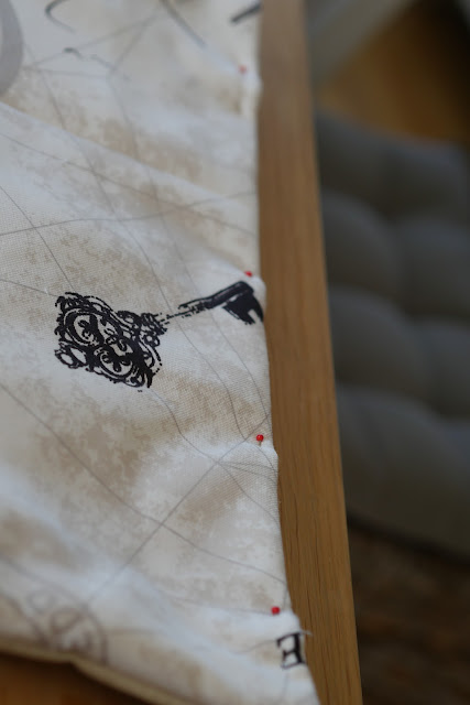Jetzt legt ihr die zusammen genähte Stoffe mit der schönen Seite auf die Tischdecke. Steckt sie an den beiden langen und einer kurzen Seite mit ein paar Stecknadeln fest.