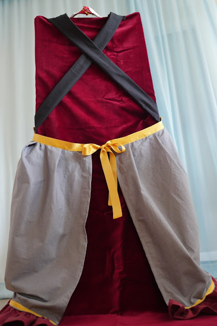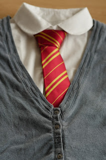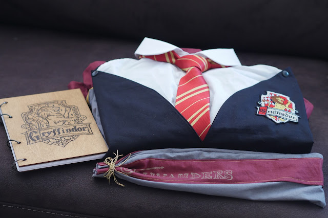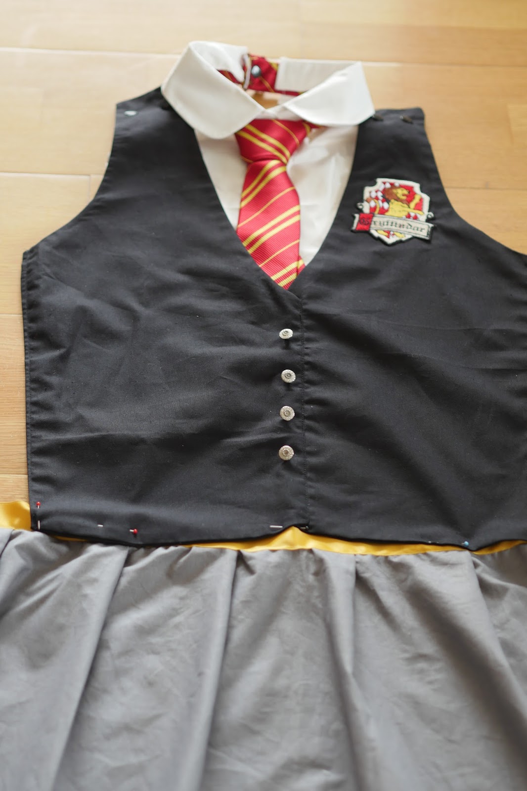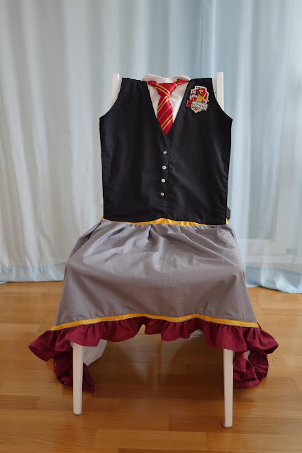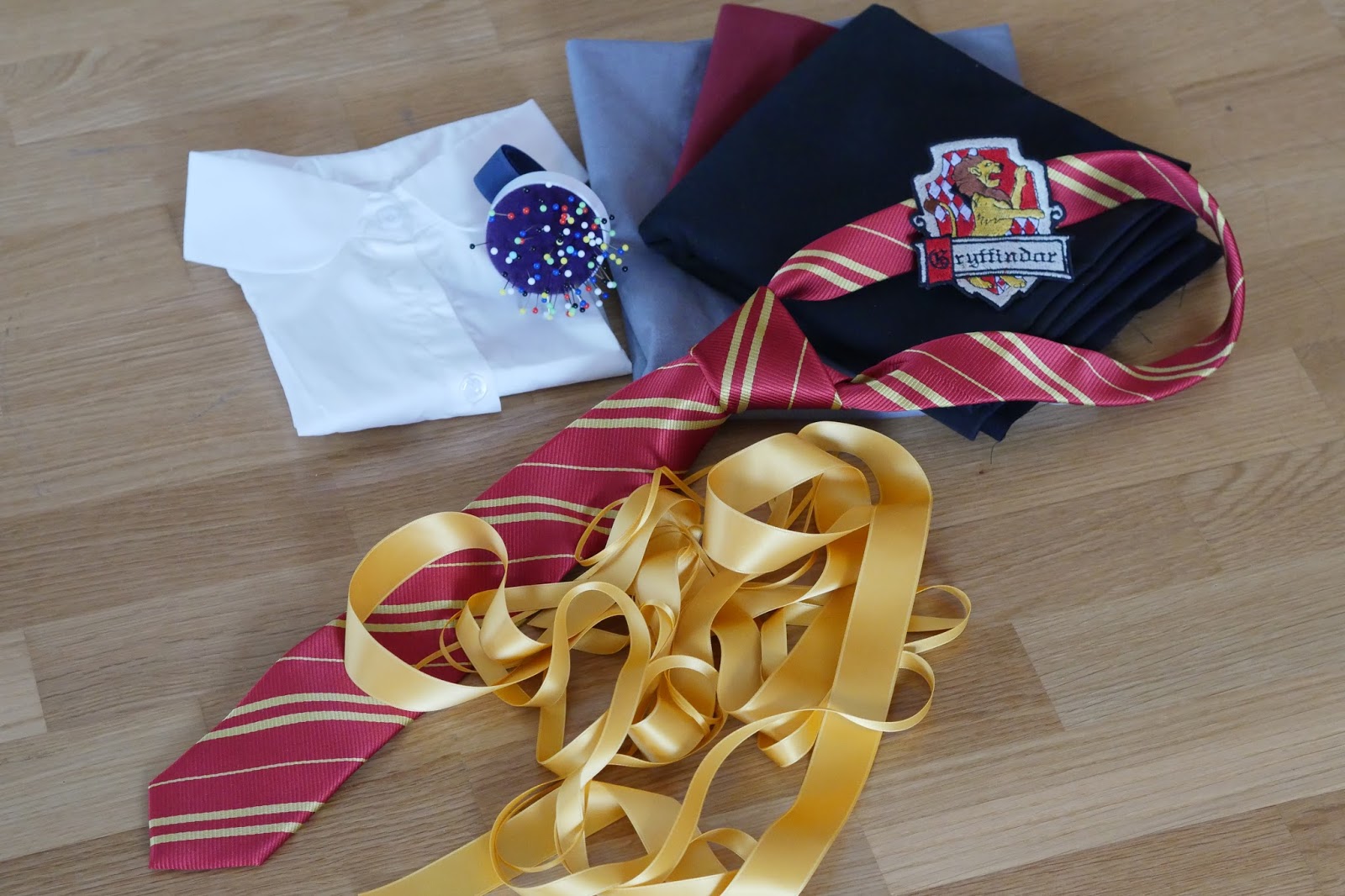 Alles, was ihr für die Schürze braucht ist Stoff in grau und schwarz sowie der Farbe des Hogwarts Hauses. In diesem Fall habe ich mich für bordeauxrot für Gryffindor entschieden. Außerdem braucht ihr eine alte Bluse oder fake Bluse (Was das ist sieht man später auf den Fotos), jede Menge Stecknadeln einen Aufnäher von einem Hogwarts Haus sowie eine dazugehörige Krawatte und Bänder in der passenden Haus Farbe (Da ich mich beim Stoff für bordeaux entschieden habe sind meine Bänder goldgelb).