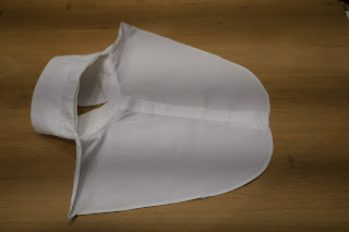 Trennt den Rückenteil der Bluse ab, sodass hinten nur noch der Kragen da ist. Wenn ihr eine normale Bluse und keine Fakebluse habt müssen außerdemdie Ärmel ab.