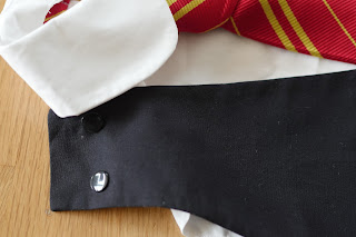 An die Enden der Krawatte habe ich Druckknöpfe angebracht und die Krawatte an die Bluse genäht. Die Krawatte wird später die Bluse um den Hals halten.