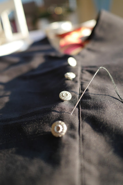 Um die Bluse extra waschen zu können habe ich auch bei der Verbindung zur Weste Druckknöpfe angebracht. Natürlich könnt ihr die Bluse auch annähen – müsst aber dann sicher gehen, dass euer schwarzer Stoff nicht abfärbt.