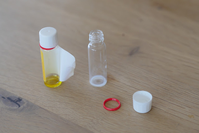 Natürlich könnt ihr auch andere Phiolen oder Fläschchen verwenden… Wenn ihr Probenflaschen habt, dann müsst ihr das Ettiket lösen und den Deckel entfernen…